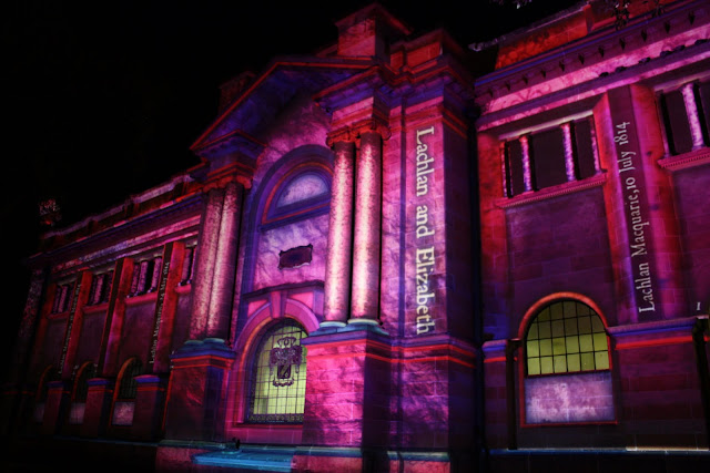 The State Library of New South Wales on Macquarie Street featured light projections as part of Macquarie Visions at this year's Vivid Sydney Festival. The theme of the display was Words On The Street, featuring documents and words that showcase Australia and the people from 1810. The library is celebrating its 100th anniversary this year and is home to many Macquarie items and artefacts.