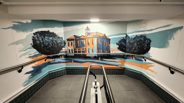 This is part of an extensive mural along the walls of the walkways and travelators leading from the underground car park to Rockdale Plaza shopping centre, in the southern suburb of Rockdale. The mural was created by Joe Whyte in 2022 and depicts historic moments and landmarks from the local area. This depicts an old high school in the area.